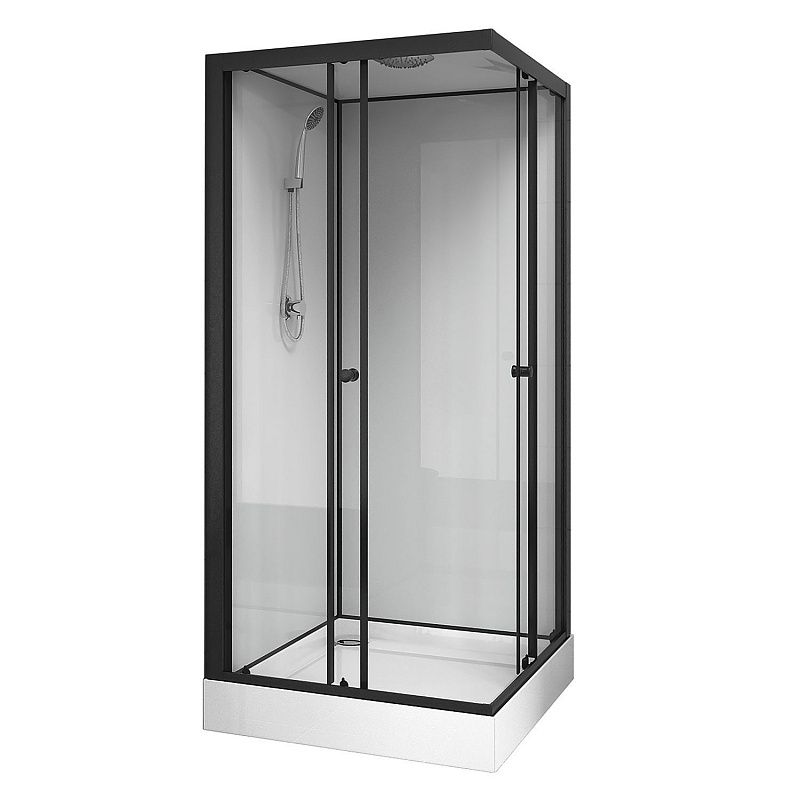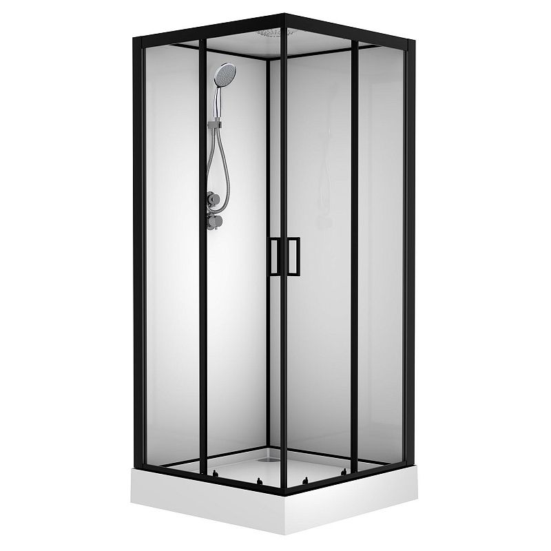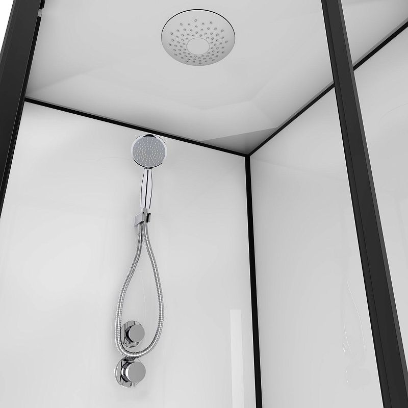 CS-22110 Душевая кабина 90x90x(190+15)см с низким поддоном 15см, прозрачное закаленное стекло 5 мм, задние стеклянные стенки БЕЛЫЕ, профиль черный-мат., верхний душ, хромированный ручной душ + шланг для душа + хромированный держатель (3 места)