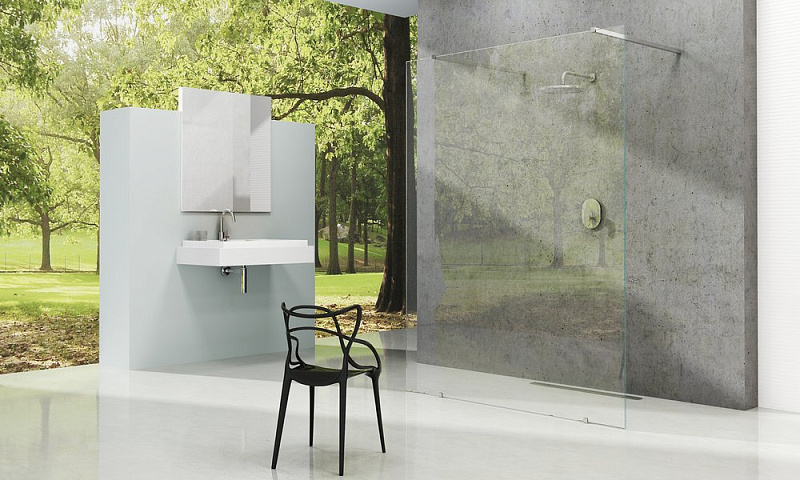 Стабильность душевого ограждения обеспечивают 2 нижних металлический фиксатора, которые крепятся к полу и 2 верхних держателя, каждый из которых который состоит из алюминиевой штанги в цвете блестящий хром и двух заглушек.