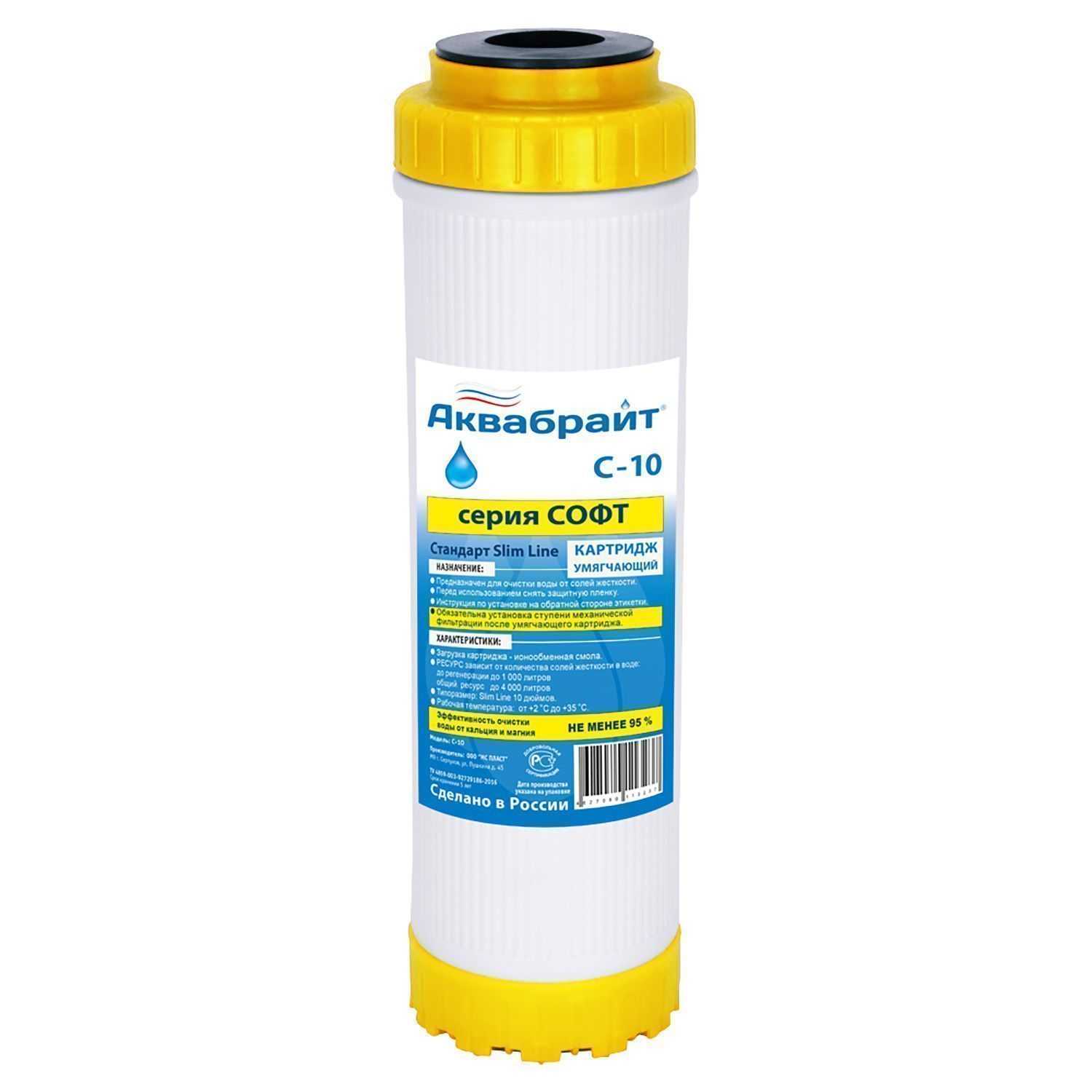 С-10, Картридж для умягчения воды АКВАБРАЙТ. Наполнитель из ионнообменой смолы  (с возможностью регенарации). Типоразмер SLIM 10". Ресурс до 4000 литров (зависит от качества воды).