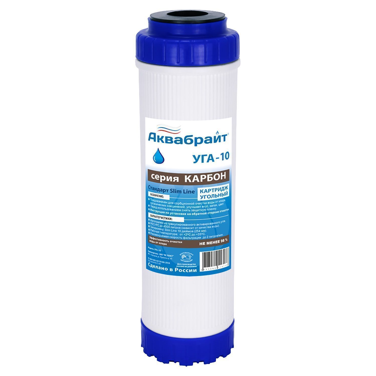 УГА-10, Картридж АКВАБРАЙТ из гранулированного активированного угля для механической и сорбционной очистки воды от грязи, песка, хлора и органических соединений, Улучшает органолептические показатели воды (вкус, запах и цвет). Типоразмер SLIMLINE 10 дюймов. Ресурс до 4000 литров.