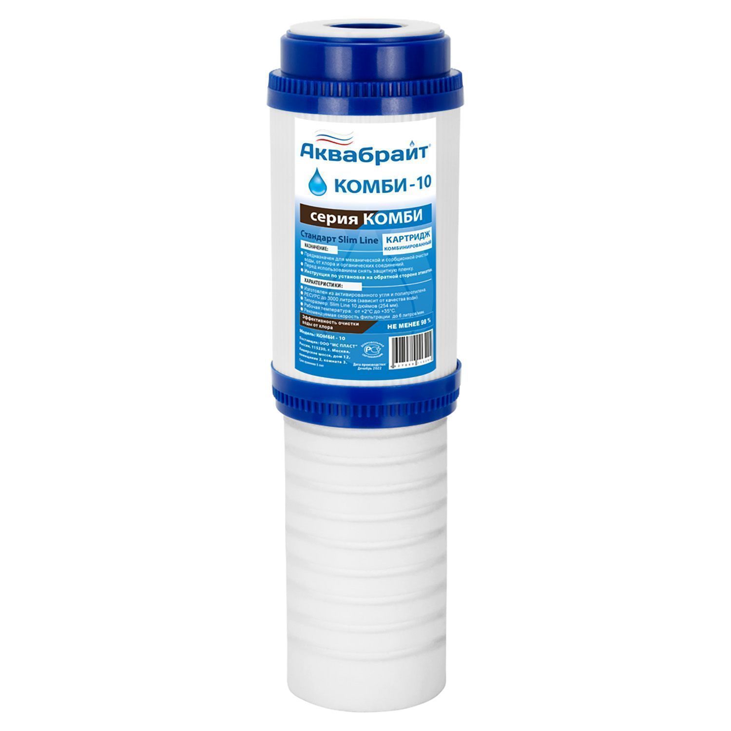 КОМБИ-10, Комбинированный картридж АКВАБРАЙТ для механической и сорбционной очистки воды от грязи, песка, хлора и органических соединений, Типоразмер SLIMLINE 10 дюймов. Улучшает  органолептические показатели воды  (вкус,  запах и цвет). Ресурс до 3000 литров.