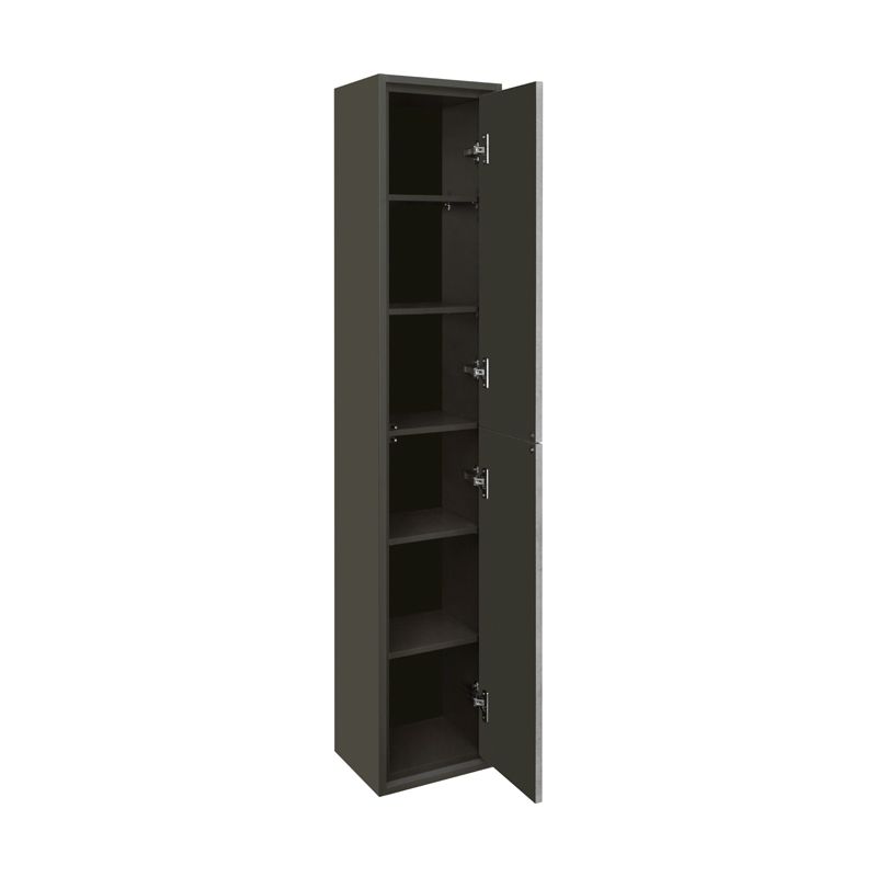 Подвесная шкаф-колонна Уэльс состоит из двух вместительных отделений с фасадами-створками из МДФ и покрытых матовой пленкой "авеллино грей". Пространство каждого отделения разделено двумя полками, регулируемыми по высоте. Фасады открываются легким нажатием при помощи системы push-to-open. Изделие универсально - при установке достаточно выбрать левое или правое навешивание. За распашными дверцами на удобных полках колонны можно размесить множество необходимых в ванной вещей: от банных полотенец до косметических принадлежностей для всей семьи.