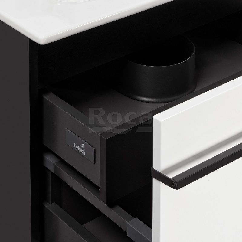 Четкая геометрия линий, сдержанность и широкий функционал – три определения, которые лучше всего описывают коллекцию Aneto. Фасад модуля Aneto размера 600 мм выполнен из MDF, окрашенной в белоснежный глянец, а корпус и левая боковая стенка – из влагостойкой ламинированной плиты в черном цвете. За фасадом находится небольшой внутренний ящик, открывающийся с помощью системы push-to-open и идеально подходящий для хранения небольших мелочей. Вместительный внешний ящик позволит разместить более крупные предметы. Тонкая и изящная ручка в черном матовом цвете подчеркивает графичность дизайна коллекции и может использоваться как полотенцедержатель. Модуль комплектуется керамической раковиной Roca Victoria-N.