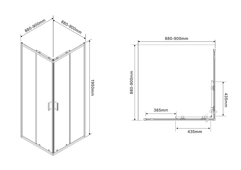 Квадратный душевой уголок, с двумя раздвижными дверьми,