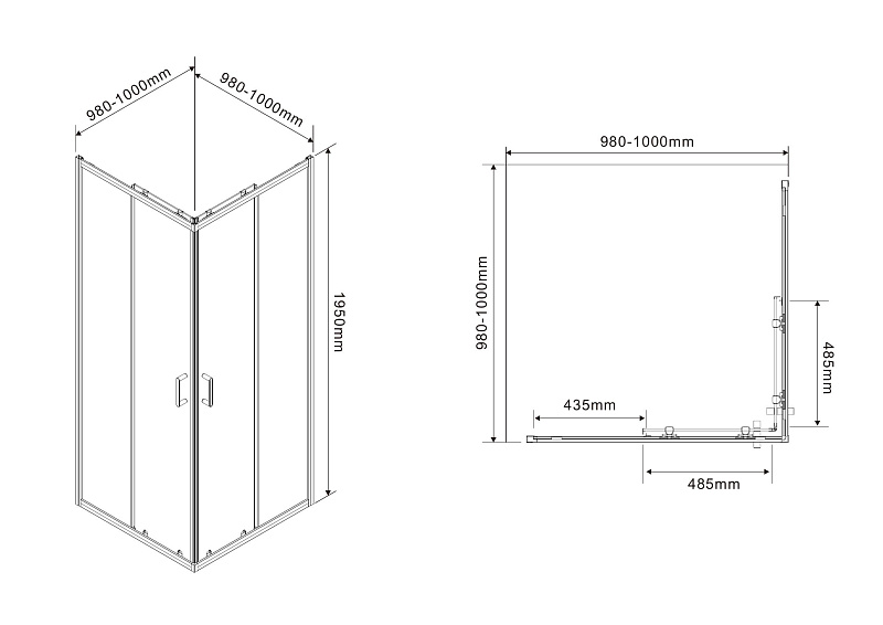Квадратный душевой уголок, с двумя раздвижными дверьми,