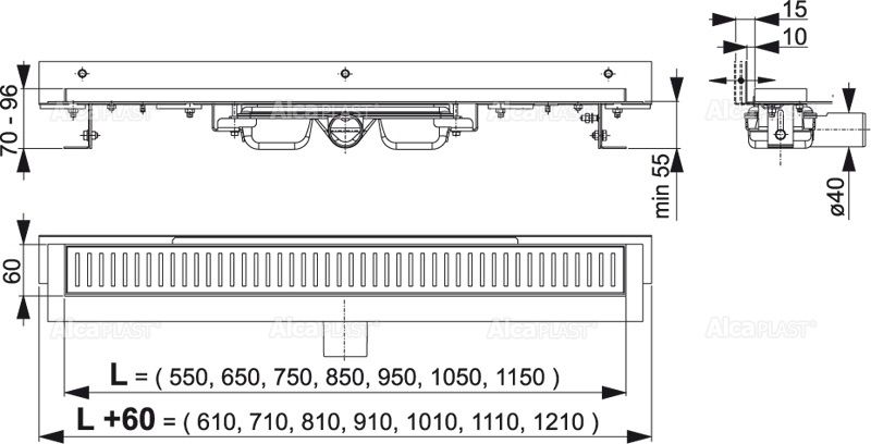 —Душевой лоток Alcadrain 550 с порогами для перфорированной решетки и регулируемым воротником к стене (APZ104-550)