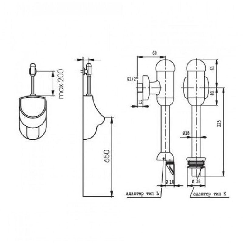 —Смывной механизм Ideal Standard для писсуара 1/2" без регулировки, для верхней подводки, с резиновым адаптором и розеткой