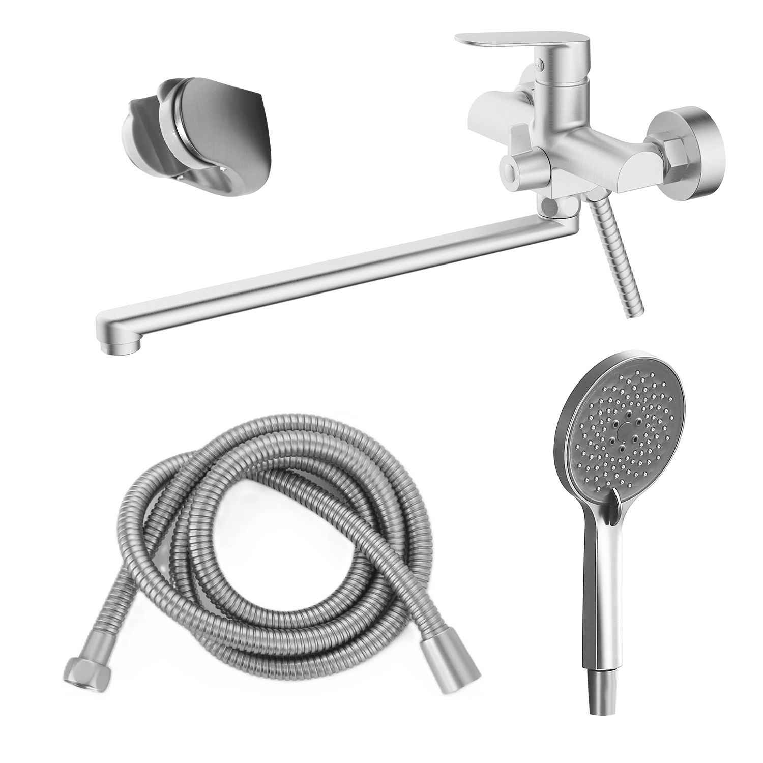 —Смеситель для ванны Azario Alanti керамический картридж, длинный излив, с ручным душем, шланг 150 см, сатин (AZ-K1732BN)