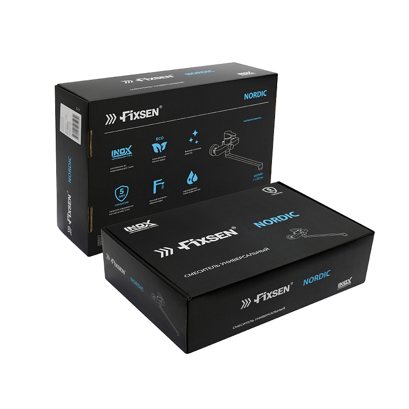 Смеситель для ванны Fixen NORDIC однорычажный, длинный излив, керамический картридж, с душевым набором, хром (FX-8801)