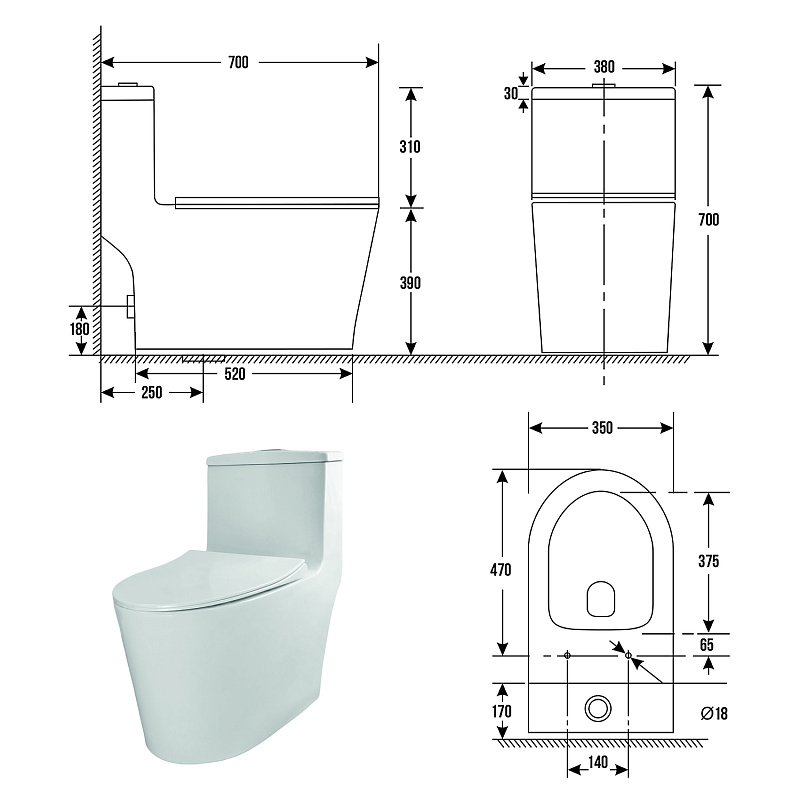 Размеры унитаза составляют 380х700х700 мм, что позволяет удобно разместить его даже в ограниченном пространстве. В комплект входит быстросъемное сиденье с функцией "Микролифт" из прочного дюропласта — оно мягко опускается, предотвращая хлопки крышки и продлевая срок службы изделия.