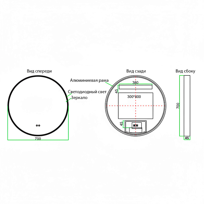 •    Алюминиевый корпус золотого матового цвета: Прочный и стильный алюминиевый корпус обеспечивает долговечность и придает зеркалу элегантный, современный вид.