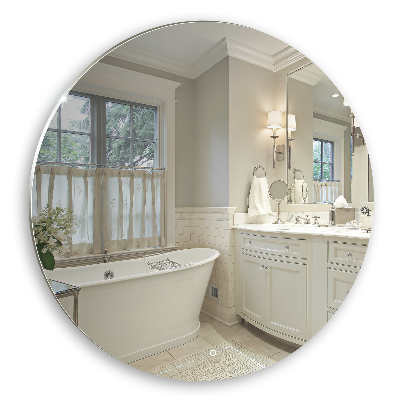 Зеркало идеальной круглой формы  из стекла высшего качества M0 (влагостойкое, минимальные оптические искажения). Простая геометрия смотрится изыскано благодаря светодиодной подсветке по периметру. Мягкий свет подсветки создает эффект парения и невесомости зеркала. LED-подсветка выдерживает до 50 тыс. часов работы в непрерывном режиме. Изделие оснащено сенсорным выключателем с функцией плавного диммирования, с запоминанием последнего значения. Короткие касания светящейся области включают/выключают подсветку, длительное касание меняет яркость свечения. Прочная обрешетка упаковки защитит зеркало от повреждений. Экологически чистый продукт выполненный по стандартам ЕС.